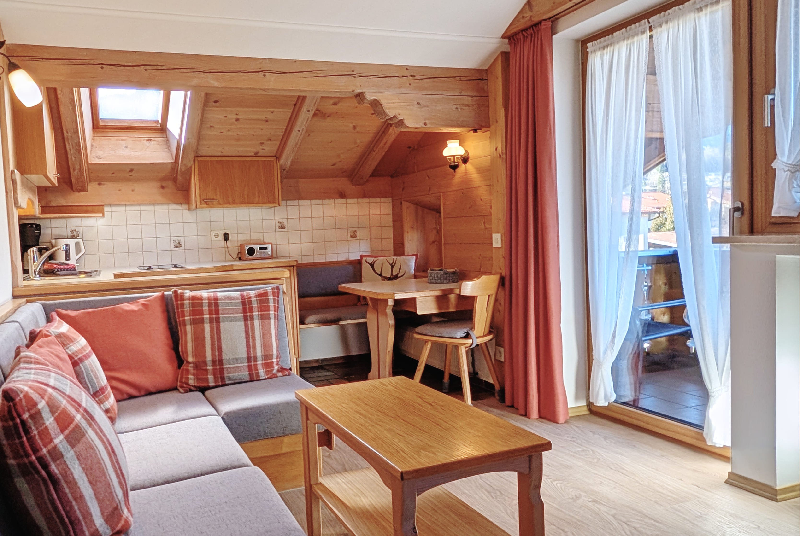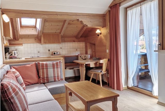 Sitzecke, voll ausgestattete Küche mit Kaffeemaschine, Wasserkocher, Ceran-Kochfeld, Mikrowelle, Toaster, Eierkocher, Spülmittel, Geschirrtücher